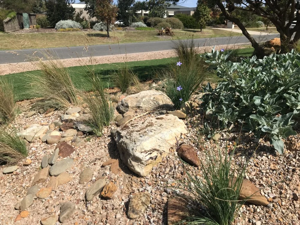 The project included the removal of the existing front garden to make way for a new design. The design featured two large natural-shaped mounds covered in crushed rock creating natural forms and secondly, the forms created privacy from the street frontage. Mounds were densely scattered with native grasses and wildflowers, leading to a large turf area edged with corten steel.