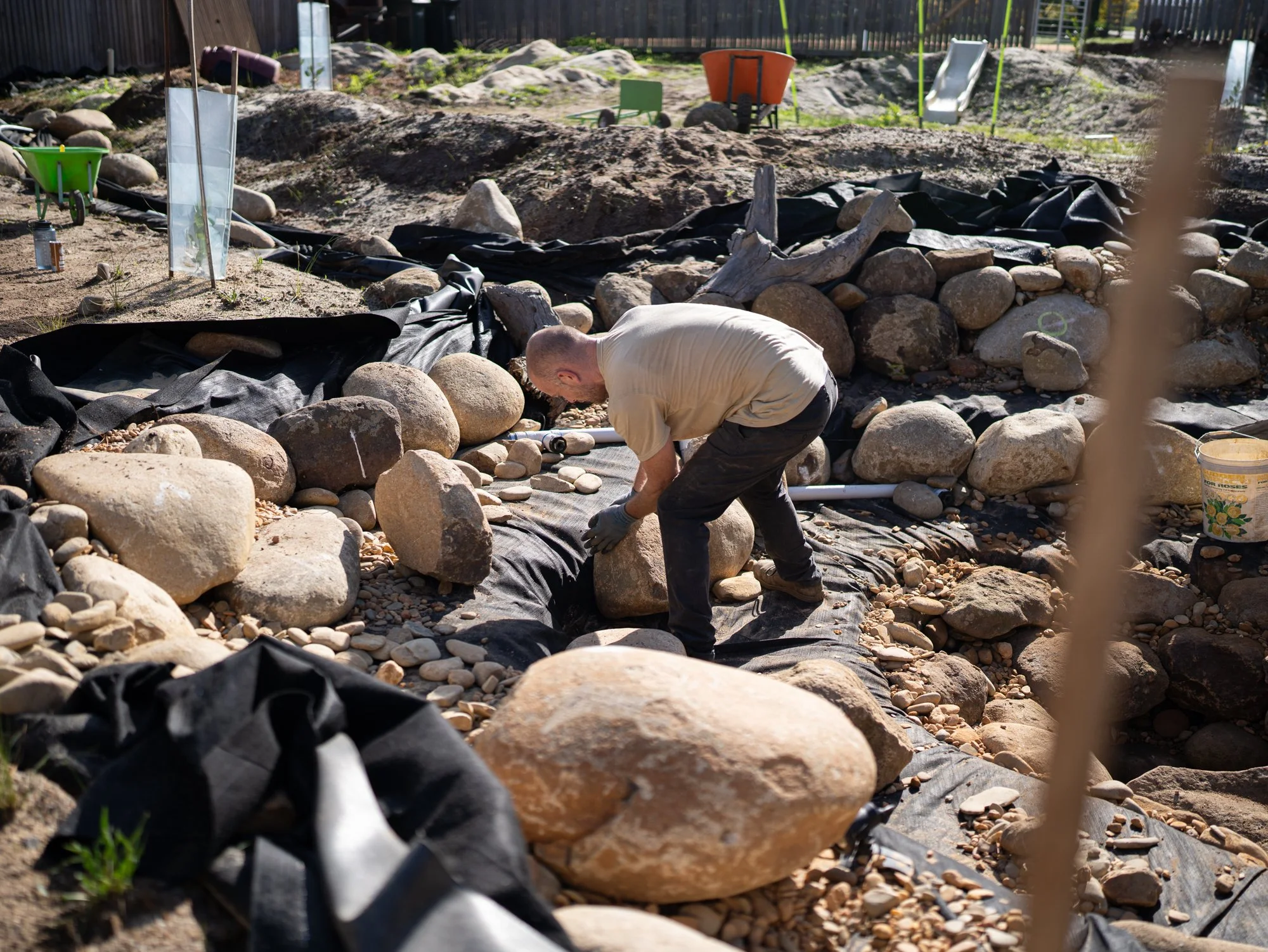 Beautiful native habitat garden designed for nature and a young family. It features no-dig vegetable gardens, winding paths, a fire pit, and recycled wood seating and retaining walls alongside hidden sections of lawn for play & picnics.